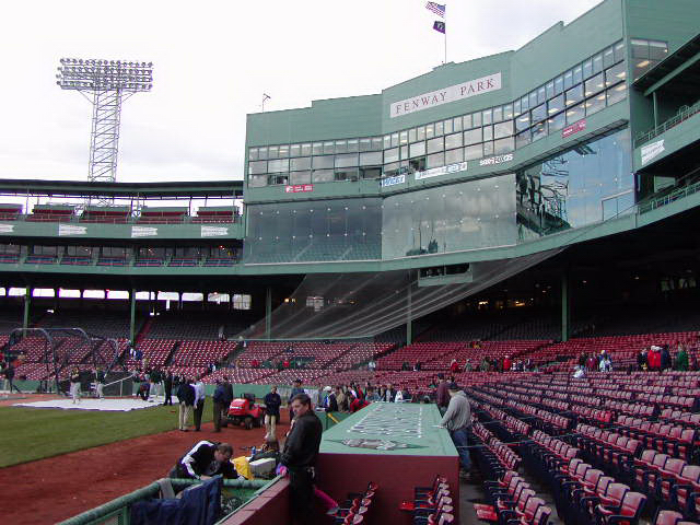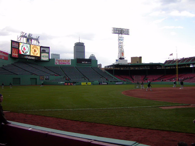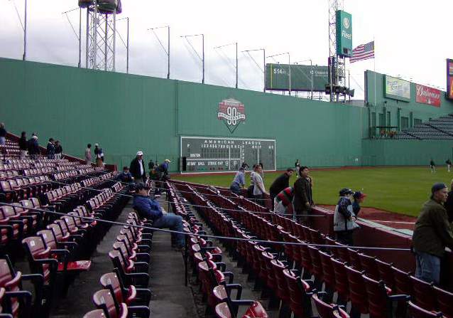 Das Left Field mit dem Green Monster und dem manuellen Scoreboard, in 2002 zeigt die Bemalung den 90. Geburtstag von Fenway. Rund 30 Meter dahinter läuft der Massachusetts Turnpike, eine viel befahrerne Autobahn. Dazwischen noch eine kleine Straße und ein paar Häuser. Hier sieht man auch schon ein typisches Fenway-Problem: Das Left-Field ist von den meisten Plätzen entlang der Third Base Line nur schwer einsehbar.