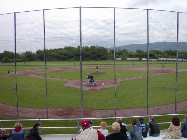 Blick vom höchsten Punkt der Tribüne hinter Home. Der Backstop ist viel zu dicht und mit zu vielen Pfosten versehen - wie in Deutschland leider so häufig. Hinter dem Outfied erheben sich die Hügel des Odenwaldes aus der Rheinebene.